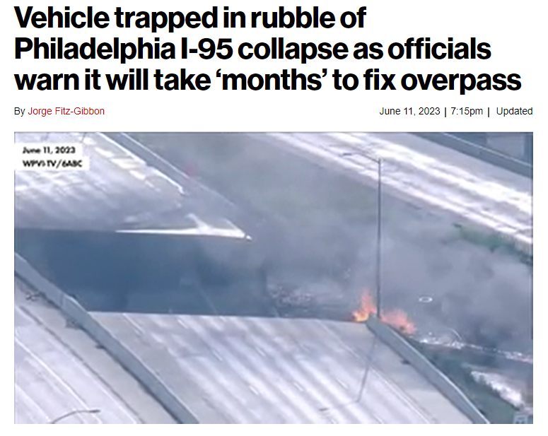 日前,美國費城東北部科特曼大道出口附近的 95 號州際公路下發(fā)生車輛起火,導致部分高速公路坍塌。