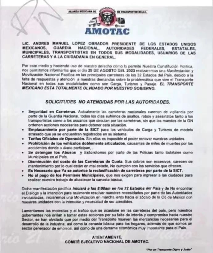 AMOTAC在一份新聞稿中稱:“我們對可能在國家高速公路上造成的不便和交通感到遺憾,但由于當(dāng)局對我們部門缺乏興趣和承諾,迫使我們采取這些行動,他們忘記了我們通過運(yùn)輸運(yùn)輸行業(yè)發(fā)展所必需的商品。”